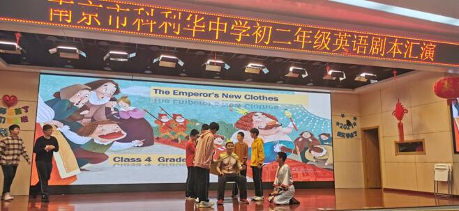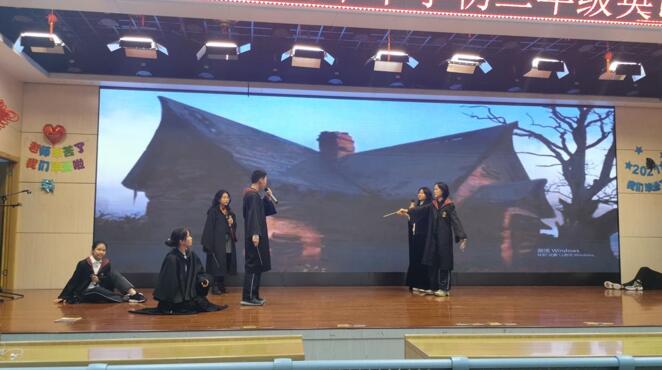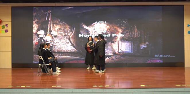 初二(4)班在舞台上呈现了经典作品The Emperor’s New Clothes,作品既演出了喜闻乐见的经典桥段,也充分展现了同学们的个人风采。伴着熟悉的音乐,初二(6)班将Harry Potter的故事娓娓道来,他们高还原度的演出让现场的“哈迷们”过足了瘾,生动的表演仿佛带我们走进了“霍格沃兹”。