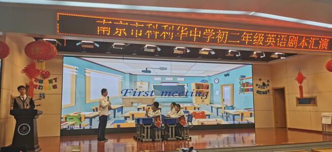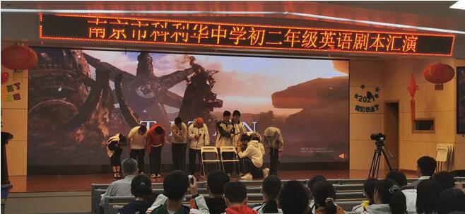 展演在主持人的报幕声中拉开了帷幕。初二(2)班的短剧The Avengers率先展示,一开场便高潮不断,剧本的幽默台词和同学们的精湛演技赢得了台下的阵阵掌声与笑声。随后,初二(3)班同学带来了原创话剧Never Say Goodbye,他们将日常班级生活与老师的经典语录融入剧中,贴近生活的表演让同学们深受触动。